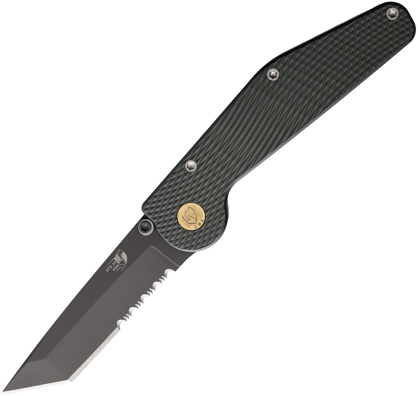 Automatic opening.4.75″ (12.07cm) closed. 3.5″ (8.89cm) gray coated partially serrated ATS-34 stainless tanto blade. Green checkered aluminum handle. Thumb stud. Pocket clip. Brass push button. Boxed.