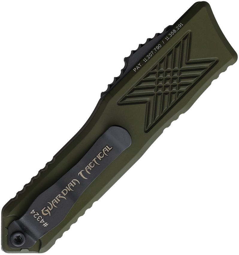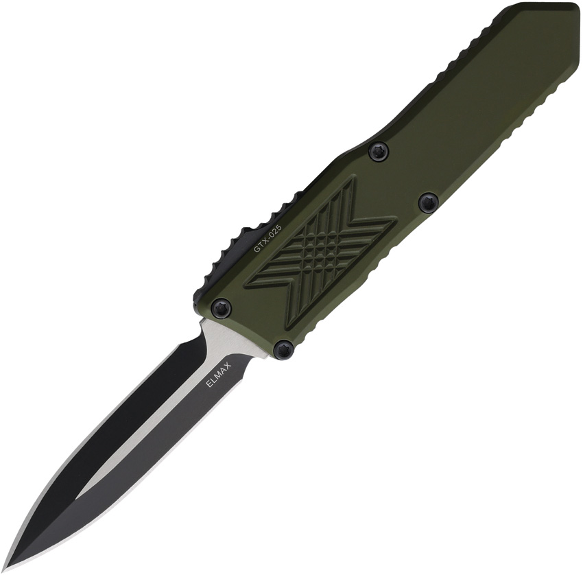 Automatic opening. 4″ (10.16cm) closed. 2.5″ (6.35cm) two-tone finish double edge Elmax steel dagger blade. OD green aluminum handle. Glass breaker. Pocket clip. Boxed.