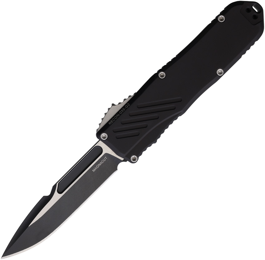4.5″ (11.43cm) closed. 3.5″ (8.89cm) two-tone finish MagnaCut steel spear point blade. Black aluminum handle. Lanyard hole. Pocket clip. Boxed.