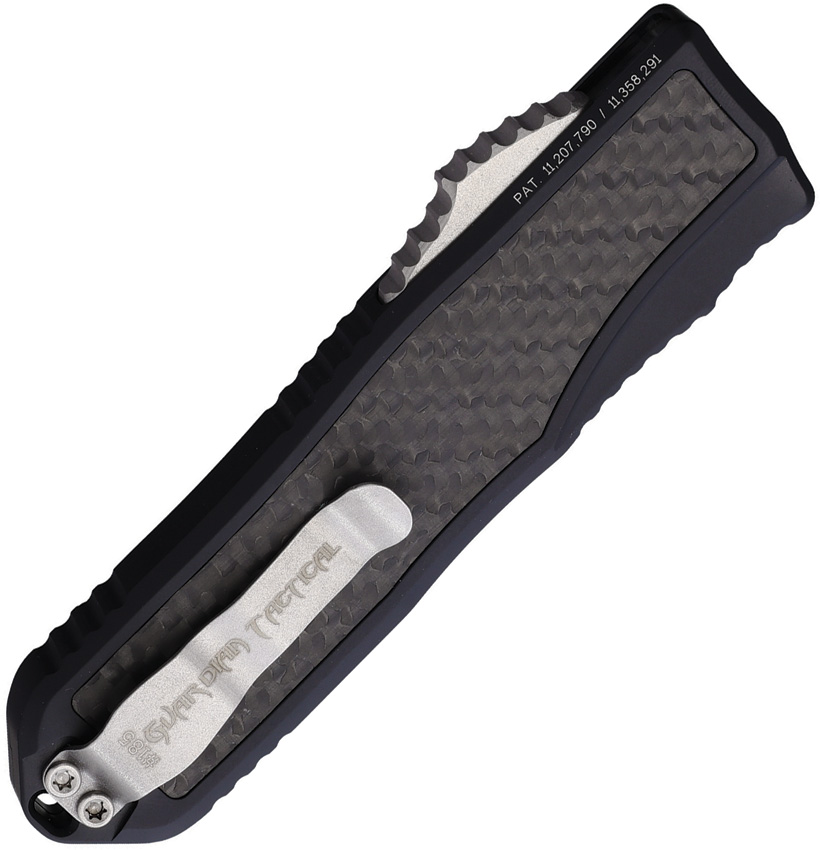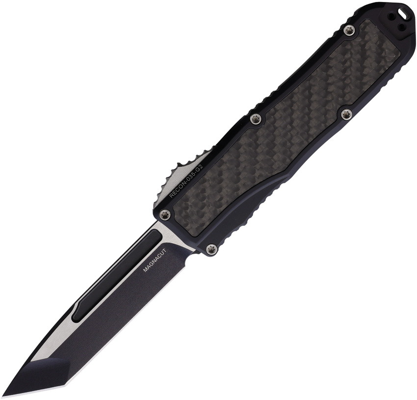 Automatic opening. 4.5″” (11.43cm) closed. 3.5″” (8.89cm) two-tone finish MagnaCut steel tanto blade. Black aluminum handle with carbon fiber inlay. Lanyard hole. Pocket clip. Boxed.