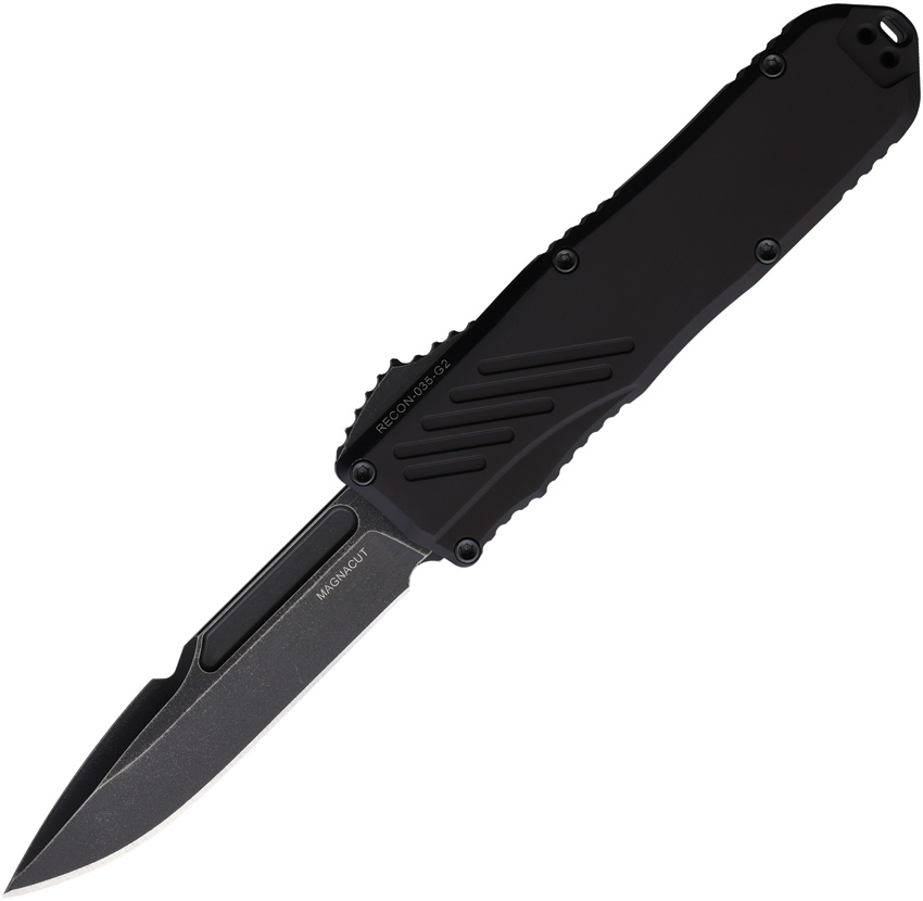 Automatic opening. 4.5″ (11.43cm) closed. 3.5″ (8.89cm) black stonewash finish MagnaCut steel spear point blade. Black aluminum handle. Lanyard hole. Pocket clip. Boxed.