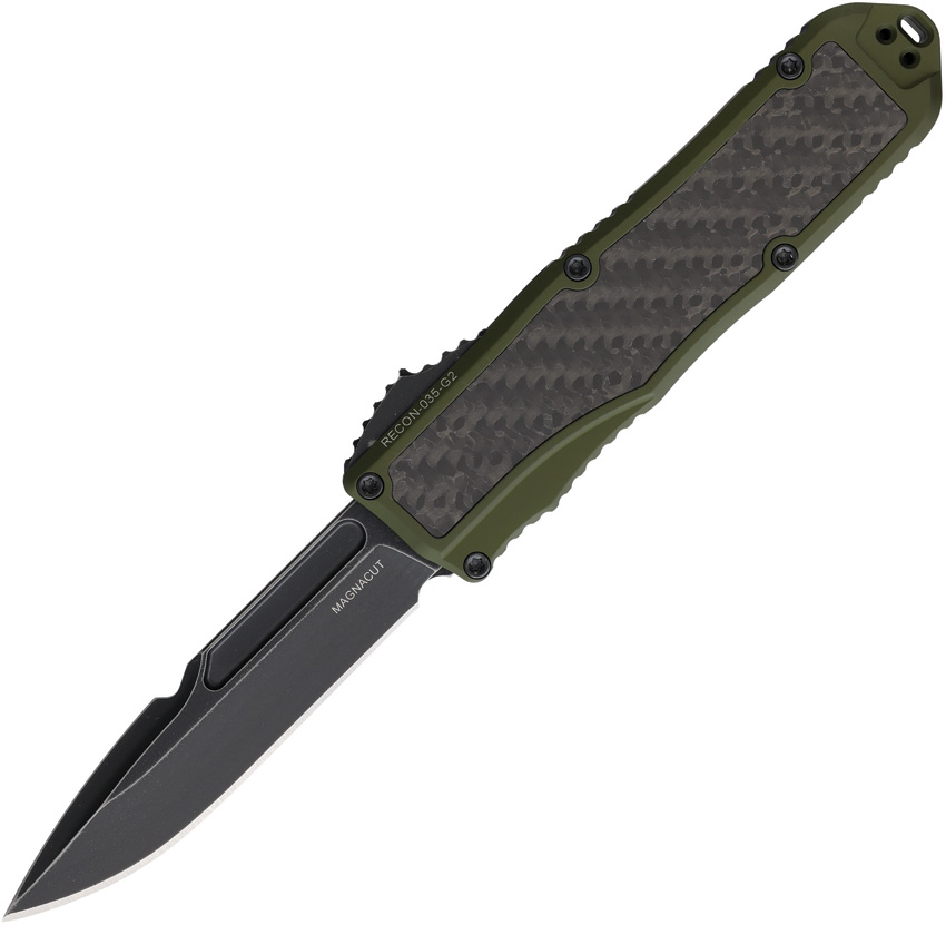 Automatic opening. 4.5″ (11.43cm) closed. 3.5″ (8.89cm) black stonewash finish MagnaCut steel drop point blade. OD green aluminum handle with carbon fiber inlay. Lanyard hole. Pocket clip. Boxed.