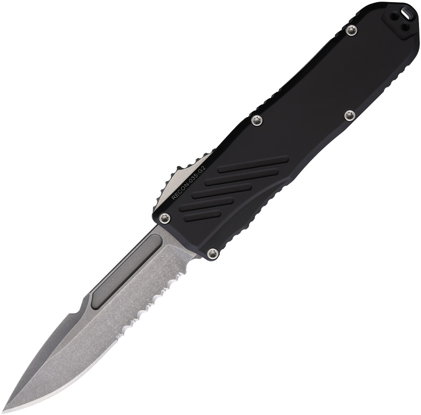 Automatic opening. 4.5″ (11.43cm) closed. 3.5″ (8.89cm) stonewash finish partially serrated MagnaCut steel spear point blade. Black aluminum handle. Lanyard hole. Pocket clip. Boxed.