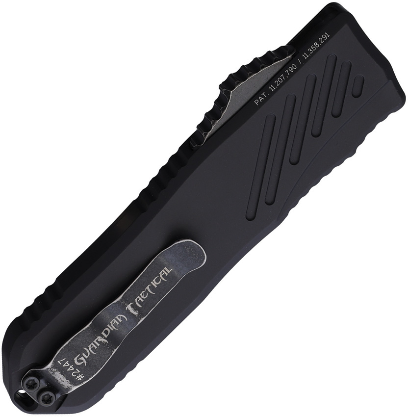 Automatic opening. 4.5″ (11.43cm) closed. 3.5″ (8.89cm) black stonewash finish double edge MagnaCut steel dagger blade. Black aluminum handle. Lanyard hole. Pocket clip. Boxed.
