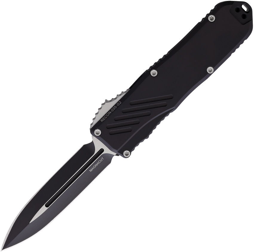 Automatic opening. 4.5″ (11.43cm) closed. 3.5″ (8.89cm) two-tone finish double edge MagnaCut steel dagger blade. Black aluminum handle. Lanyard hole. Pocket clip. Boxed.