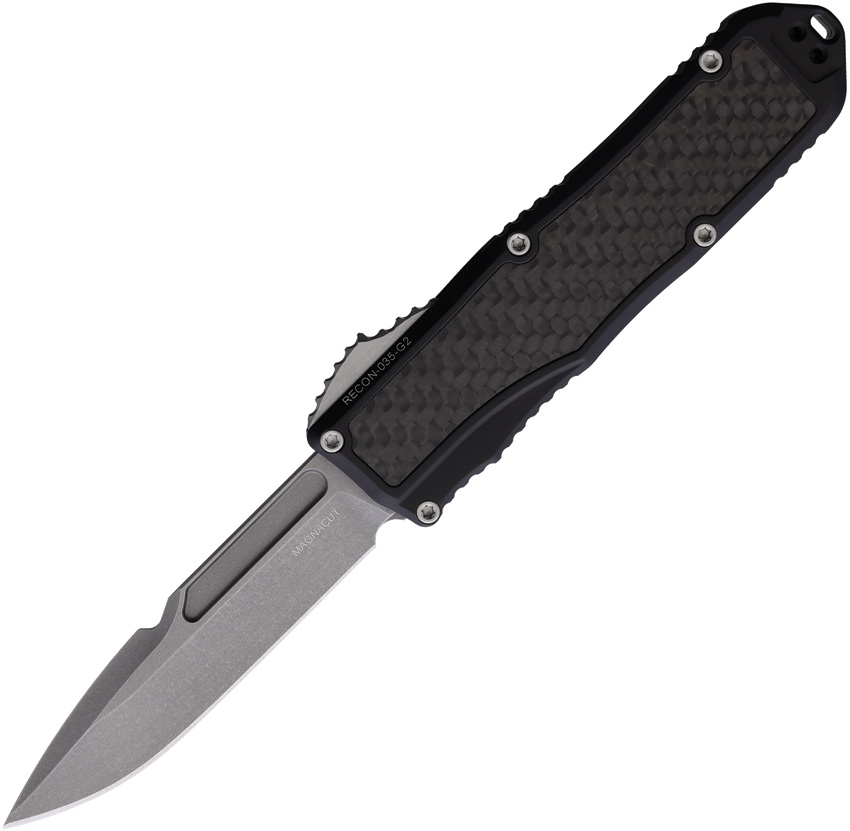 Automatic opening. 4.5″ (11.43cm) closed. 3.5″ (8.89cm) stonewash finish MagnaCut steel spear point blade. Black aluminum handle with carbon fiber inlay. Lanyard hole. Pocket clip. Boxed.