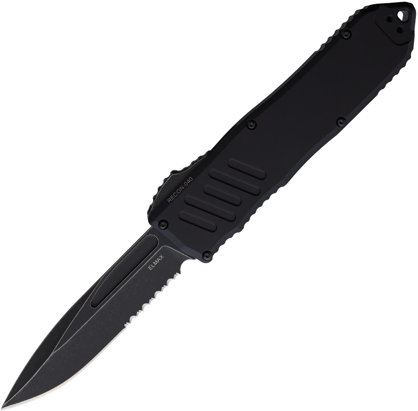 5.5″ (13.97cm) closed. 4″ (10.16cm) black stonewash finish partially serrated Elmax steel spear point blade. Black aluminum handle. Glass breaker. Lanyard hole. Pocket clip. Boxed.