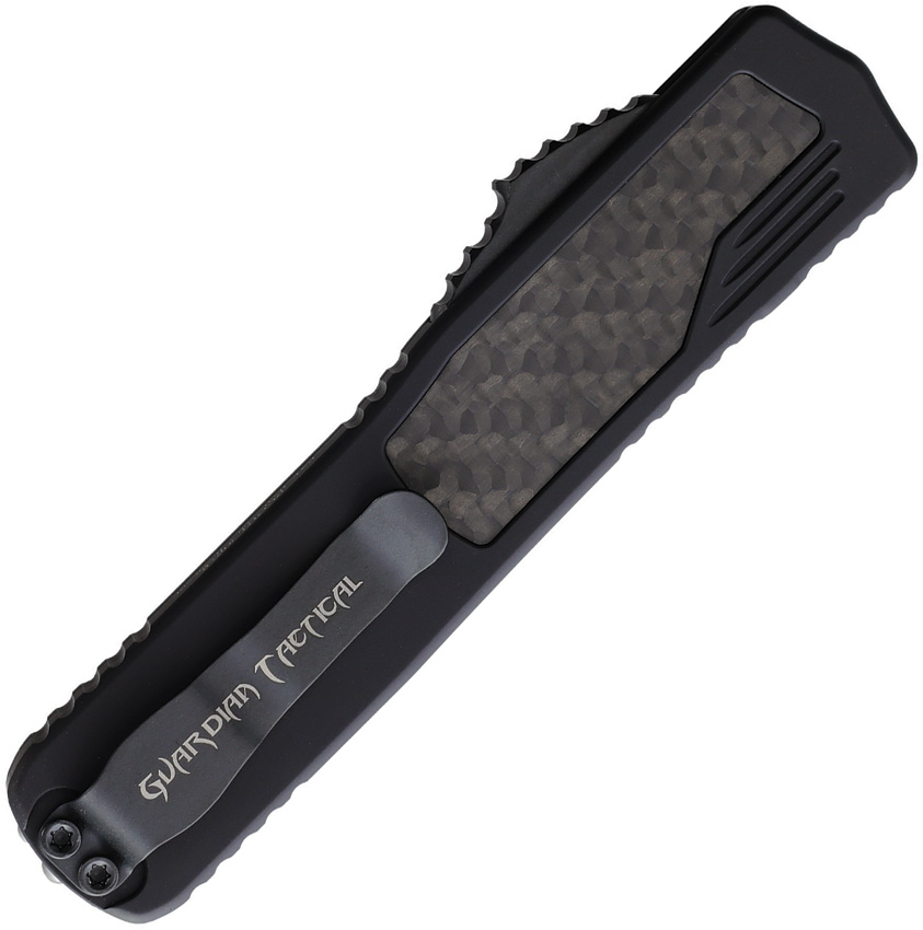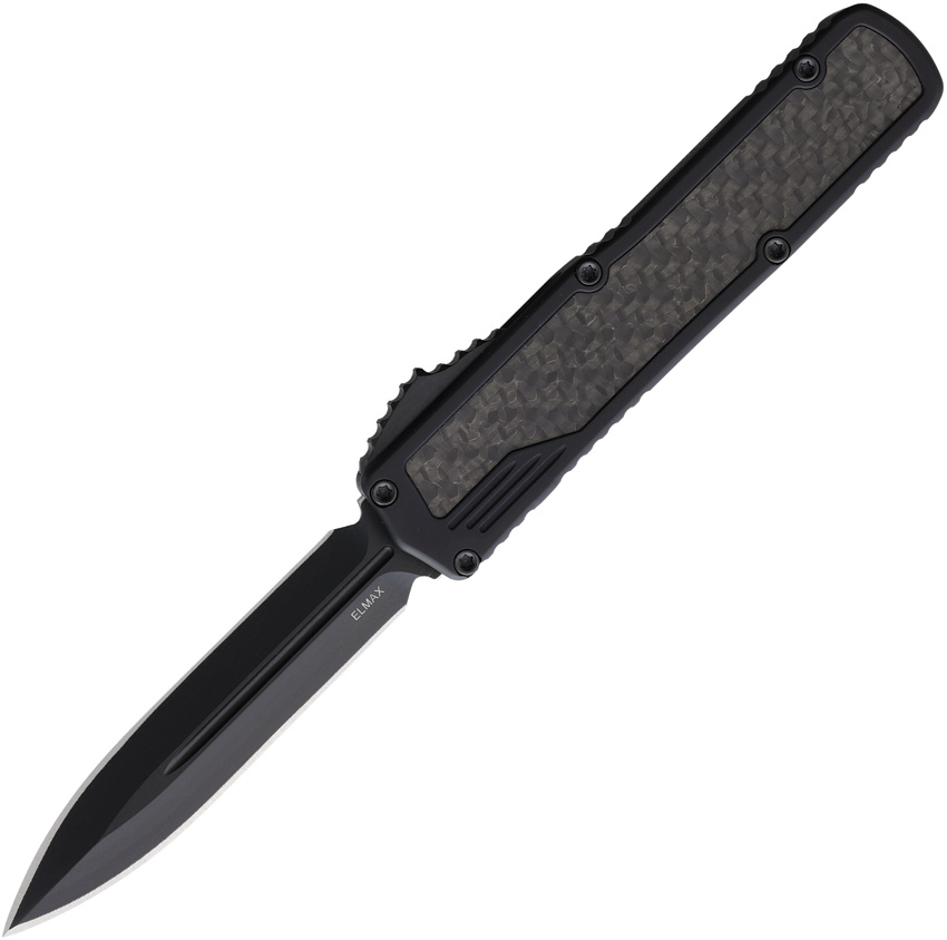 Automatic opening. 4.5″ (11.43cm) closed. 3.5″ (8.89cm) black coated double edge Elmax steel dagger blade. Black aluminum handle with carbon fiber inlay. Pocket clip. Boxed.
