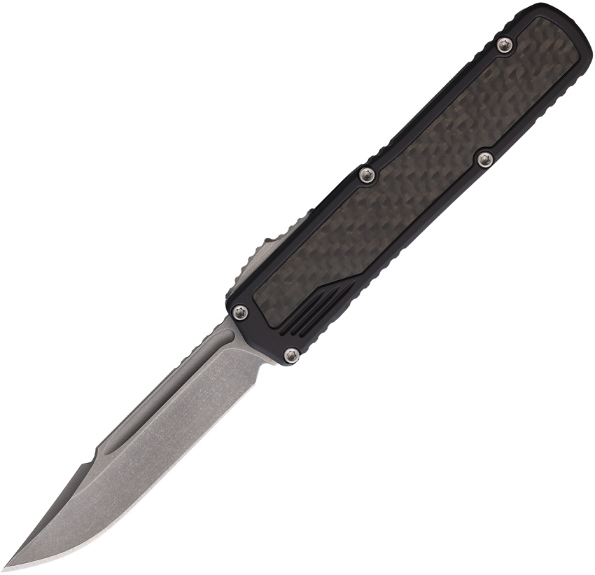 Automatic opening. 4.5″ (11.43cm) closed. 3.38″ (8.59cm) stonewash finish Elmax steel clip point blade. Black aluminum handle with carbon fiber inlay. Pocket clip. Glass breaker. Boxed.