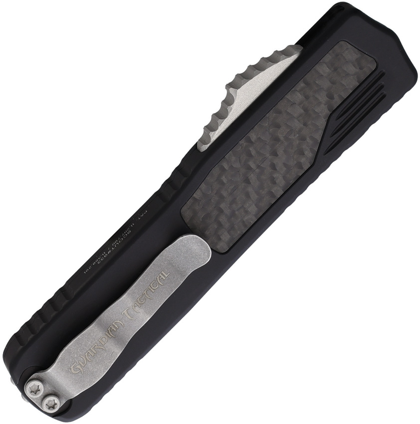 Automatic opening. 4.5″ (11.43cm) closed. 3.5″ (8.89cm) stonewash finish double edge Elmax steel dagger blade. Black aluminum handle with carbon fiber inlay. Pocket clip. Boxed.