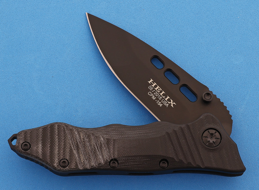 Guardian Tactical Helix Folder. Model GT31111. 5 3/8” closed frame lock. Black Teflon coated CPM154 steel drop point blade features ambidextrous thumb studs and flipper. Black G10 handles with black coated steel pocket clip. Made in U.S.A. Cardboard gift box.