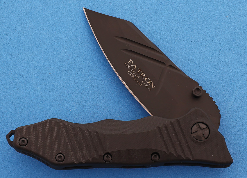 Guardian Tactical Patron Folder. Model GT22111. 5 3/8” closed frame lock. Black Teflon coated CPM154 steel modified sheepsfoot blade with ambidextrous thumb studs. Textured black G10 handles with black coated steel pocket clip. Made in U.S.A. Includes cardboard gift box and felt storage pouch with bulldog logo.