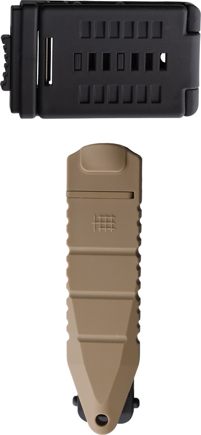 7.75″ (19.69cm) overall. 4″ (10.16cm) dark earth Teflon coated partially serrated Bohler K110 stainless modified spear point blade. Flat Dark Earth sculpted G10 handle. Full, extended tang. Finger ring. Tan molded plastic MOLLE compatible belt sheath. Boxed.