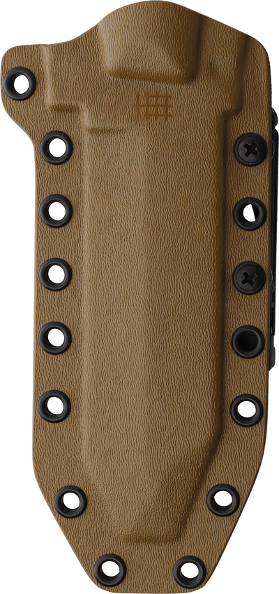 10.25″ (26.04cm) overall. 5.13″ (13.03cm) dark earth Teflon coated sawback premium steel tanto blade. Flat Dark Earth sculpted G10 handle. Full, extended tang. Lanyard hole. Partially serrated blade. Topo map blade artwork. Tan Kydex MOLLE compatible belt sheath. Boxed.