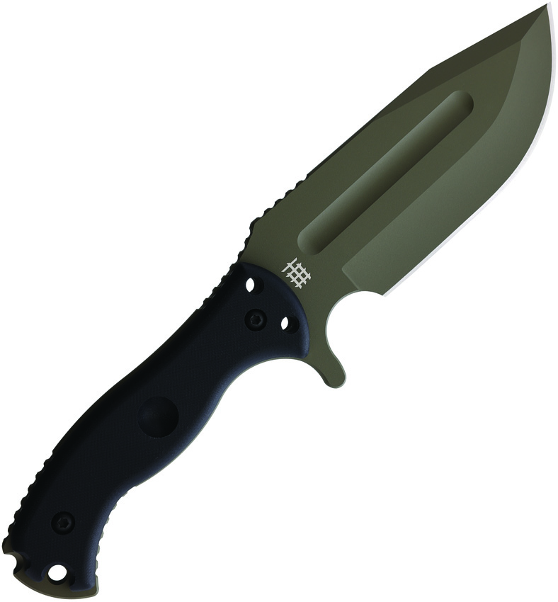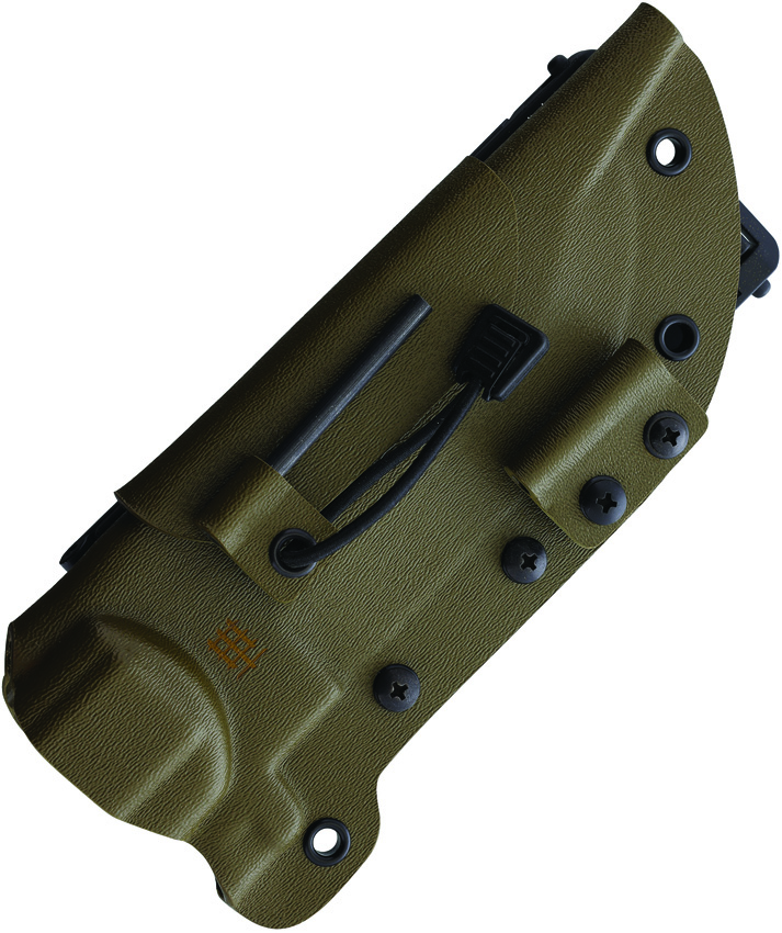 11.25″ (28.58cm) overall. 5.75″ (14.61cm) OD green Teflon coated premium steel blade. Black G10 handle. Full, extended tang. Lanyard hole. Bow drill on both sides of the handle. Crusher pommel with fire starter. Black Kydex MOLLE compatible belt sheath. Boxed.
