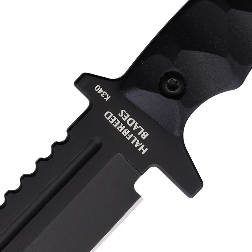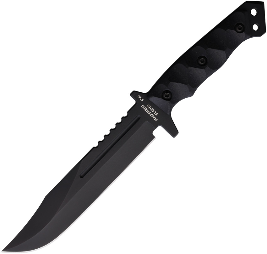 11.75″ (29.85cm) overall. 6.88″ (17.48cm) black Teflon coated Bohler K340 ISODUR tool steel clip point blade. Black sculpted G10 handle. Full, extended tang. Lanyard hole. Black Kydex MOLLE compatible belt sheath. Boxed.