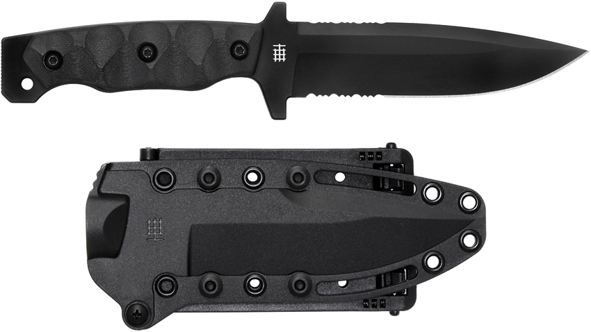 10.3″ (26.16cm) overall. 5.3″ (13.46cm) black PVD coated partially serrated Bohler K340 ISODUR tool steel modified drop point blade. Black sculpted G10 handle. Full, extended tang. Lanyard hole. Crusher pommel. Black molded plastic MOLLE compatible belt sheath. Boxed.