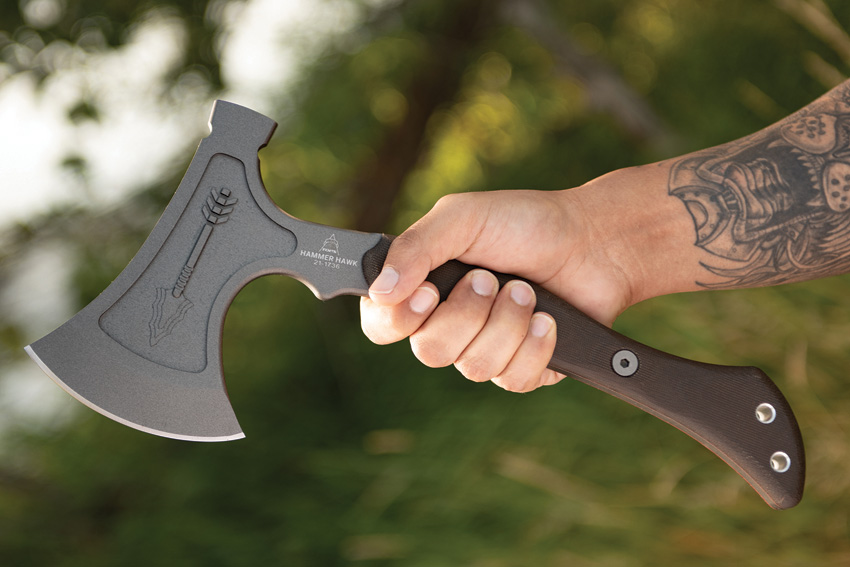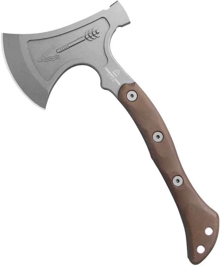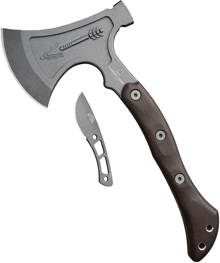 13.25″ overall. 6.5″ gray Tungsten Cerakote 1075HC steel axe head with 4.5″ cutting edge. Green canvas micarta handle. Full tang. Lanyard hole. Hammer end. Includes 5″ overall back up knife with 2.25″ blade. Two piece sheath with blade cover that is separate from the belt frog. Brown leather belt sheath. Bulk packed.