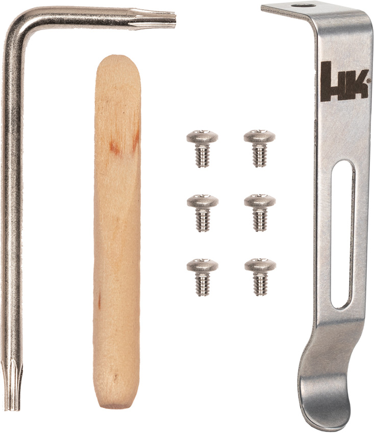 Includes: (1) Satin finish stainless deep carry pocket clip; (1) Torx L-Key; (1) Installation tool; (6) Frame screws. Designed to fit HK Incursion OTF and Mini Incursion OTF. Bulk packed.