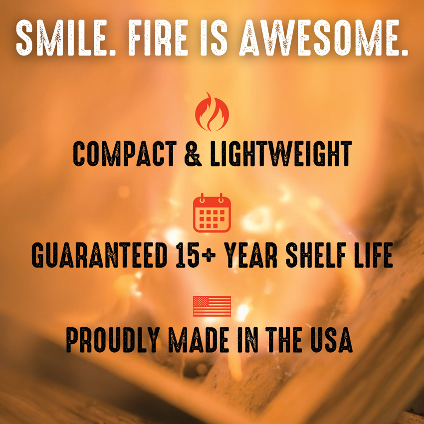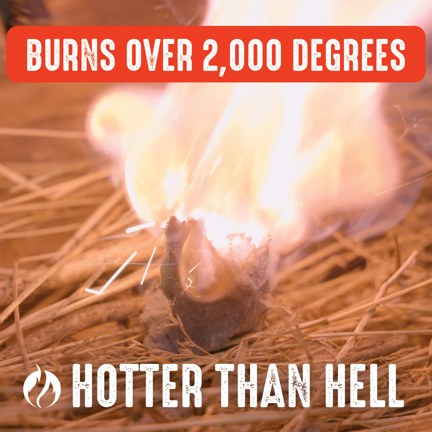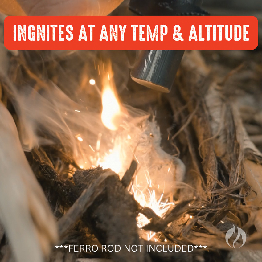 Moldable fibrous clay material. Burns over 2000 degrees. Lights damp wood and tinder. Wind and water proof. Ignites at any temperature and altitude. 15 year shelf life. Hang packaged.