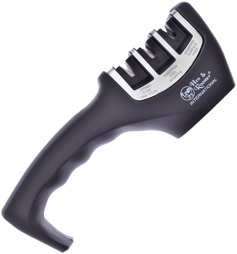 8″ overall. Black rubber handle. Non-slip base. Ceramic, Tungsten, and diamond sharpeners. Suitable for all straight edge knives. Clam packed.