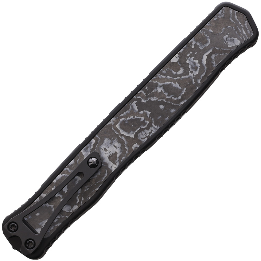 Automatic opening. 5.63″ (14.3cm) closed. 4.25″ (10.8cm) black DLC coated serrated CPM MagnaCut stainless tanto blade. Black aluminum handle with White camo carbon fiber insert. Pocket clip. Glass breaker. Boxed.