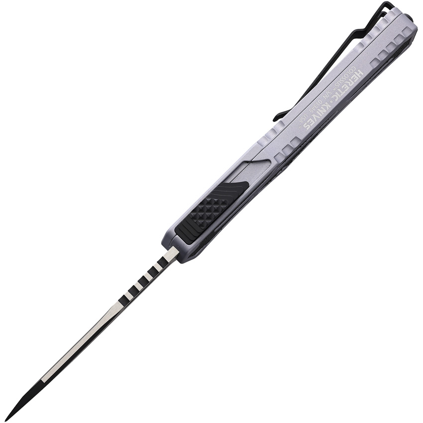 Automatic opening. 5.13″ (13.03cm) closed. 3.5″ (8.89cm) two-tone finish CPM MagnaCut stainless drop point blade. Gray aluminum handle with black traction inlay. Glass breaker. Pocket clip. Comes with small sample bottle of OTF Lube. Boxed.