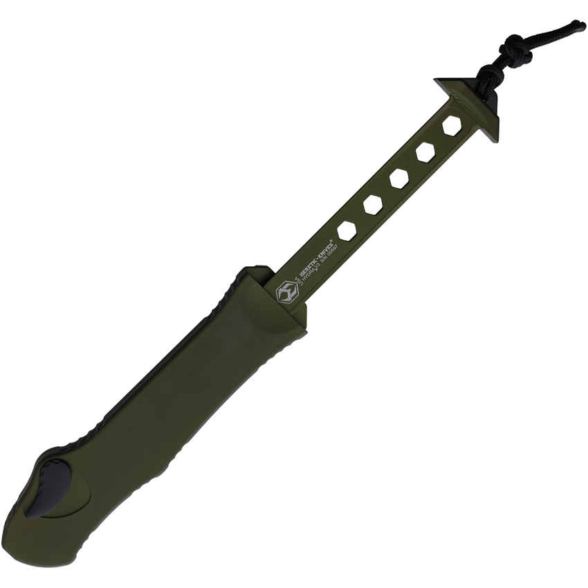 Automatic opening. 5.5″ (13.97cm) closed. 3.63″ (9.22cm) two-tone finish partially serrated MagnaCut steel tanto blade. Green aluminum handle. Lanyard hole. Pocket clip. Button safety. Boxed.