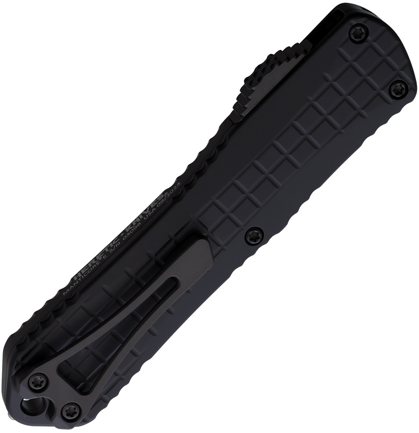 Automatic opening. 4.75″ (12.07cm) closed. 3″ (7.62cm) black DLC coated MagnaCut steel bowie blade. Black aluminum handle. Lanyard hole. Pocket clip. Glass breaker. Grenade grip. Boxed.