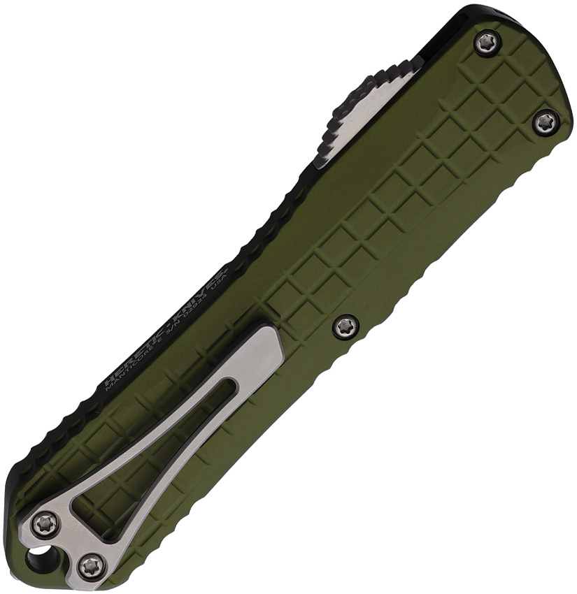 Automatic opening. 4.75″ (12.07cm) closed. 3″ (7.62cm) stonewash finish MagnaCut steel bowie blade. OD green aluminum handle. Lanyard hole. Pocket clip. Glass breaker. Grenade grip handle. Boxed.
