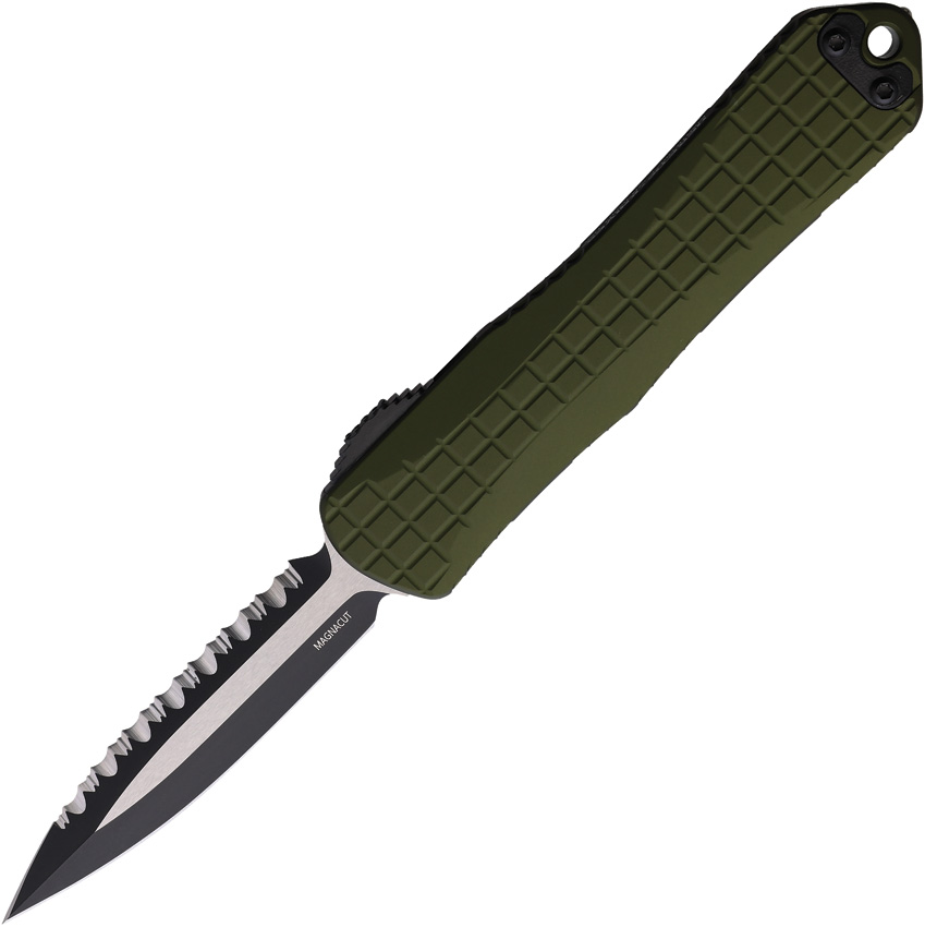 Automatic opening. 4.75″ (12.07cm) closed. 3″ (7.62cm) two-tone finish serrated CPM MagnaCut stainless blade. OD green anodized aluminum handle. Lanyard hole. Pocket clip. Glass breaker. Double edge blade. Grenade grip. Boxed.