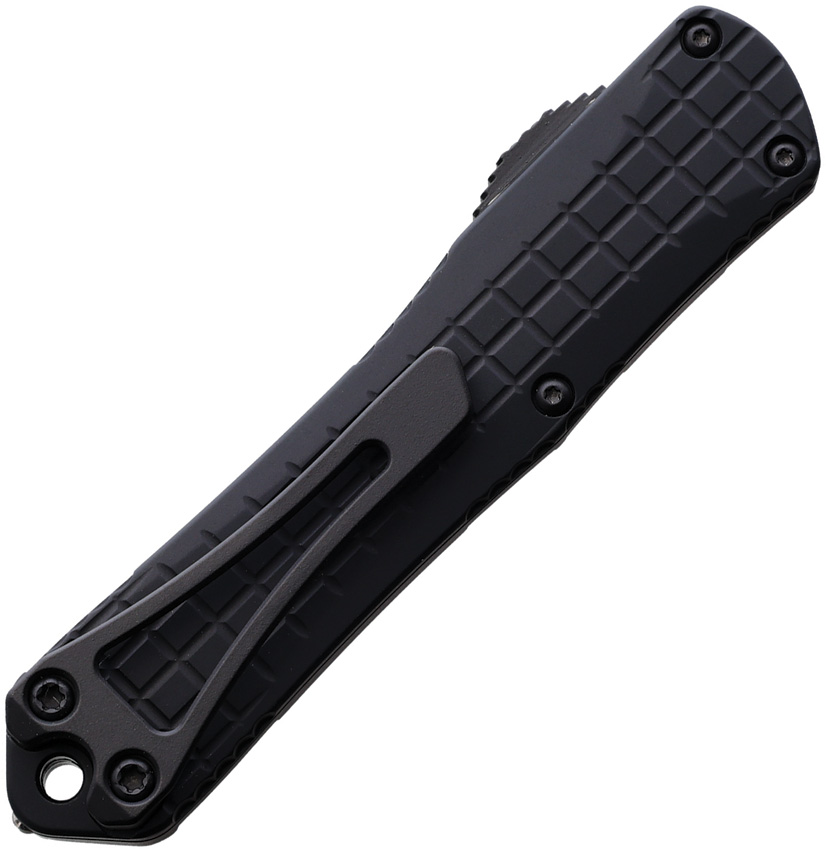 Automatic opening. 3.88″ (9.86cm) closed. 2.63″ (6.68cm) black DLC coated CPM MagnaCut stainless dagger blade. Black aluminum handle. Glass breaker. Lanyard hole. Pocket clip. Frag pattern handle. Double edge blade. Boxed.