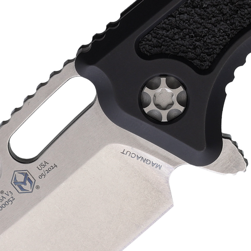 4.5″ (11.43cm) closed. 3″ (7.62cm) stonewash finish CPM MagnaCut stainless tanto blade. Black aluminum handle with Black textured synthetic inlay. Extended tang. Thumb pull. Lanyard hole. Pocket clip. Boxed.