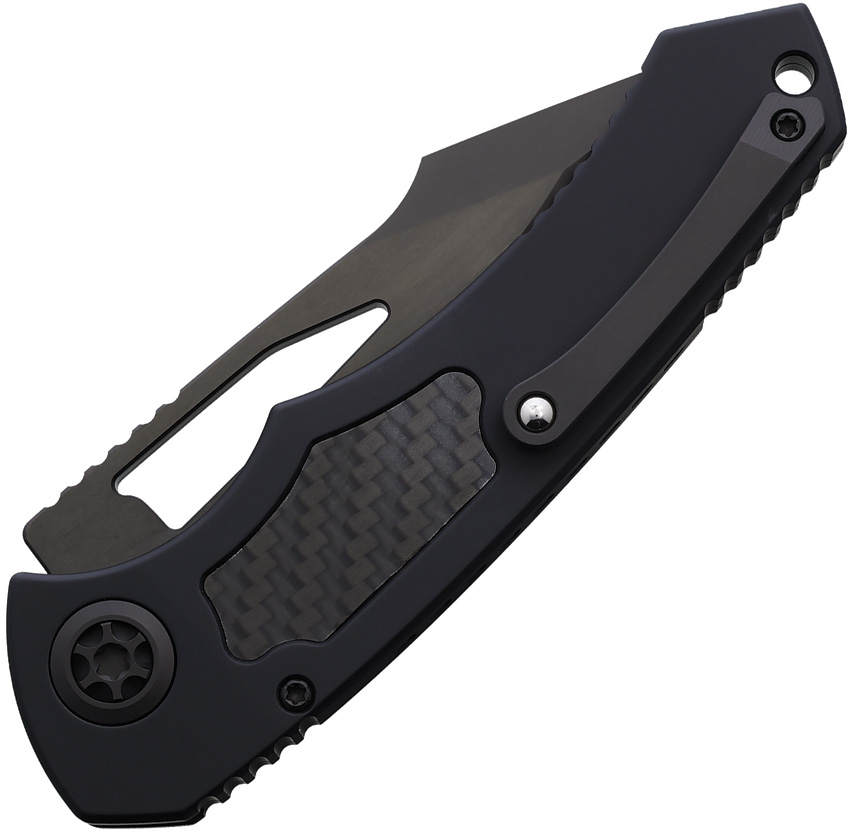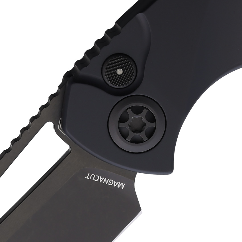 5.13″ (13.03cm) closed. 3.75″ (9.53cm) black DLC coated CPM MagnaCut stainless drop point blade. Glow carbon fiber handle. Thumb pull. Lanyard hole. Pocket clip. Tritium button inlay. Boxed.