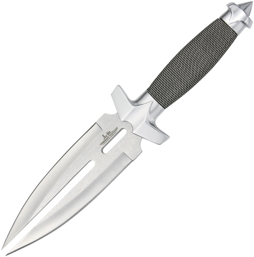 Overall: 11.5″; Blade: 6″ l Stainless; Other Info: Double edge blade with center slot cutout. Wire wrapped handle with stainless guard and pommel. Black leather belt sheath. Boxed.