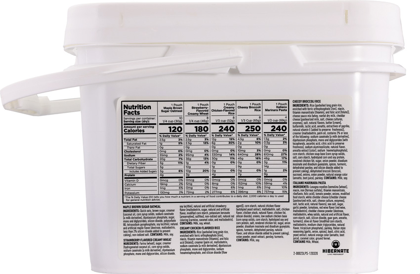 Meals include: Brown sugar oatmeal; Vanilla pudding; Strawberry-flavored creamy wheat; Creamy chicken-flavored rice; Powdered whey milk; Italiano marinara pasta; Creamy potato soup; Cheesy broccoli rice; Creamy stroganoff. 80 servings. Easy to prepare. 2,057 calories per day. One week supply. Comes in resealable plastic bucket. Boxed.