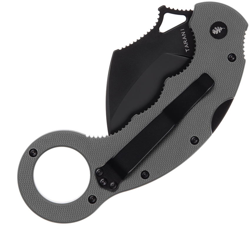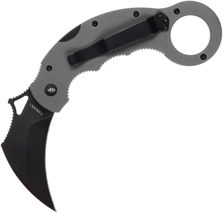 5″ (12.7cm) closed. 2.75″ (6.99cm) black PVD coated D2 tool steel karambit blade. Gray G10 handle. Pocket clip. Thumb pull. Finger ring. Extended tang. BRAMP kinetic opening. Zippered storage case.