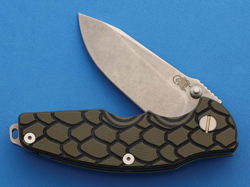 Hinderer Knives Jurassic Folder. 4 ¾” closed Frame Lock. S35 VN steel spear point blade with ambidextrous thumb studs, grooved thumb ramp and flipper. Stonewash finish. Titanium frame and pocket clip. Black and green G10 front handle scale. New in original box.