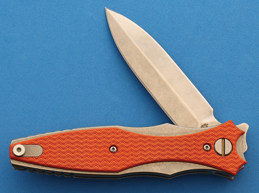 Hinderer Knives Maximus Folder. 4 ¾” closed Frame Lock. CPM20CV steel double edge dagger blade with flipper. Stonewash finish. Titanium frame and pocket clip. Orange G10 front handle scale. New in original box.