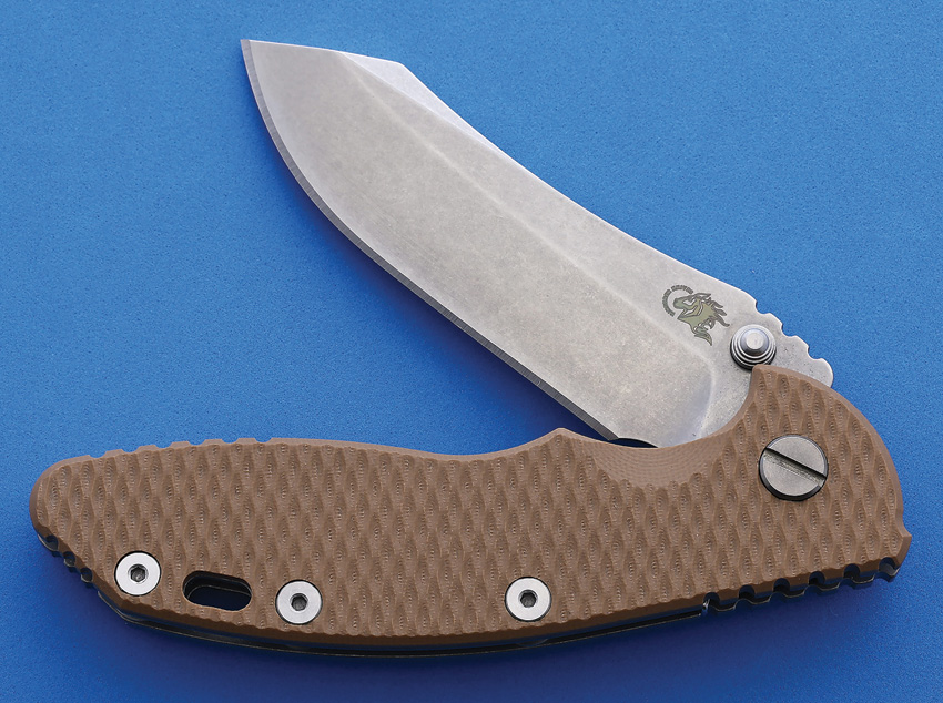 Hinderer Knives XM18 Folder. 4 ¾” closed Frame Lock. S35VN steel sheepfoot blade with ambidextrous thumb studs, grooved thumb ramp and flipper. Stonewash finish. Titanium frame and pocket clip. Brown G10 front handle scale. New in original box.