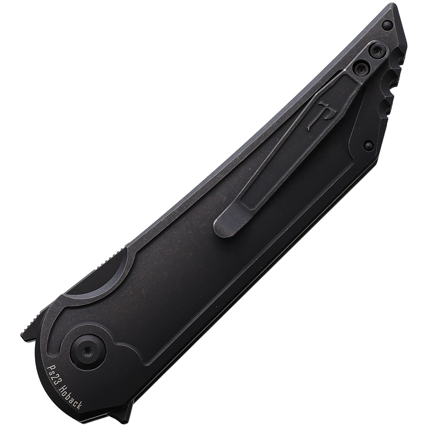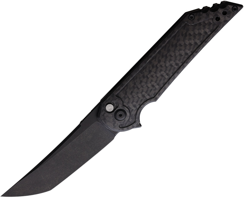 5.25″ (13.34cm) closed. 3.75″ (9.53cm) black DLC coated CPM-20CV stainless tanto blade. Carbon fiber handle with black titanium back handle. Extended tang. Pocket clip. Wooden storage box.