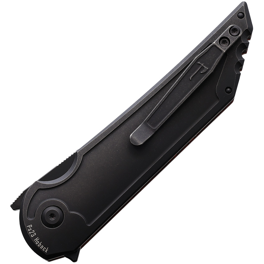 5.25″ (13.34cm) closed. 3.75″ (9.53cm) black DLC coated CPM-20CV stainless tanto blade. Mars Valley carbon fiber handle with black titanium back handle. Extended tang. Pocket clip. Wooden storage box.