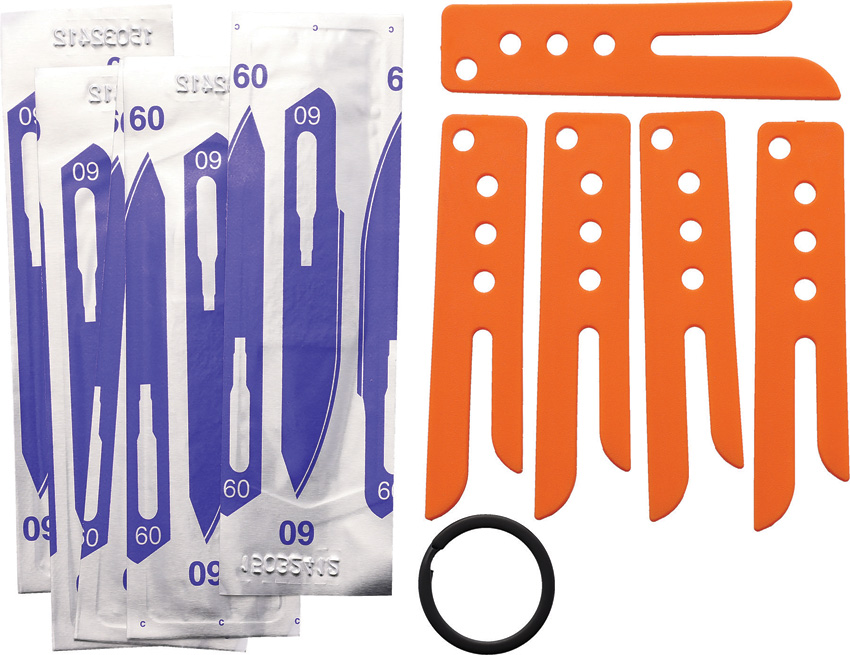 For Expel Scalpel. Safely loads scalpel blades onto knife. Protects during transport. Includes (5) 60-style scalpel blades. Compatible with other scalpel knives and blades. Color: Orange. Hang packaged.