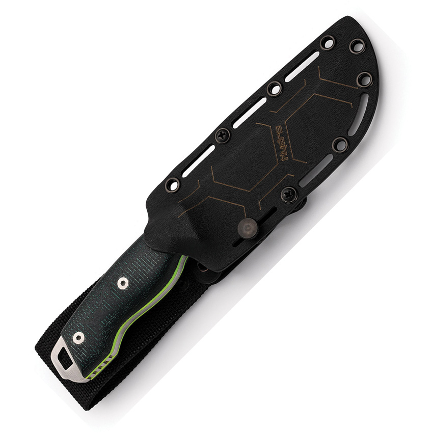 9.5″ (24.13cm) overall. 5″ (12.7cm) sand blast finish Niolox tool steel blade. Jute micarta handle. Full, extended tang. Lanyard hole. Green liners. Glass breaker pommel. Black Kydex belt sheath. Boxed.