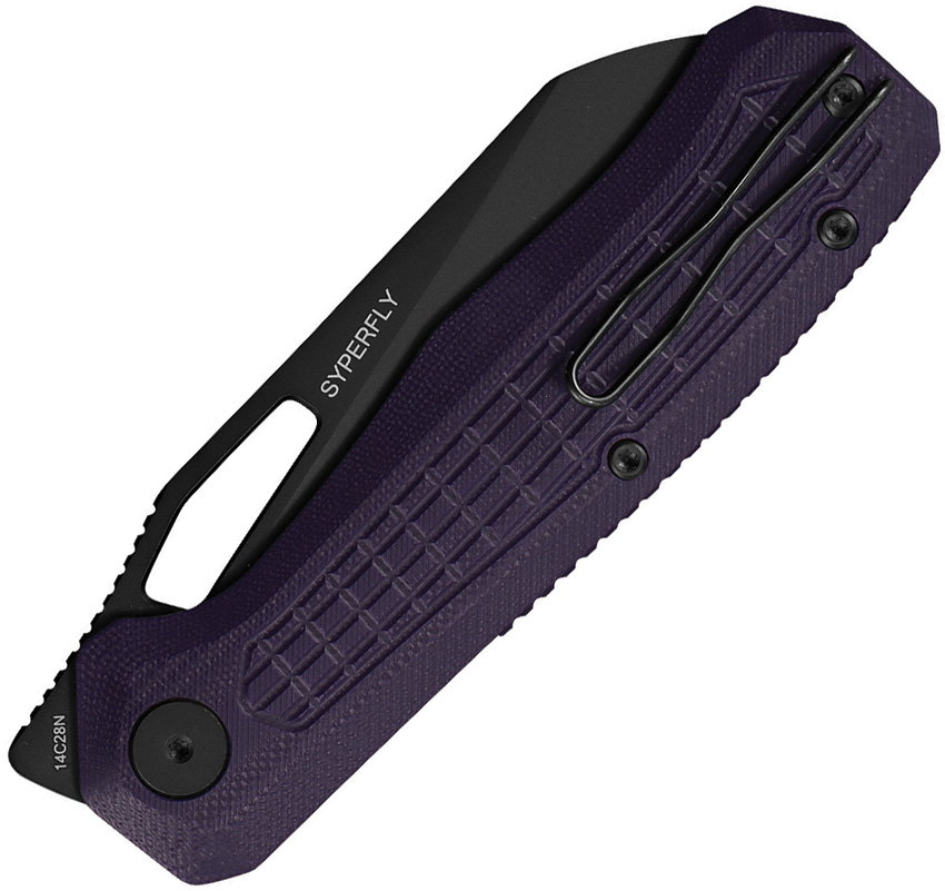 4.88″ (12.4cm) closed. 3.75″ (9.53cm) black finish 14C28N Sandvik stainless sheepsfoot blade. Purple G10 handle. Thumb pull. Pocket clip. Boxed.