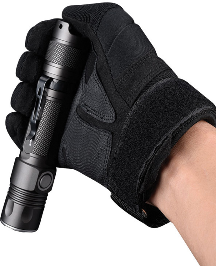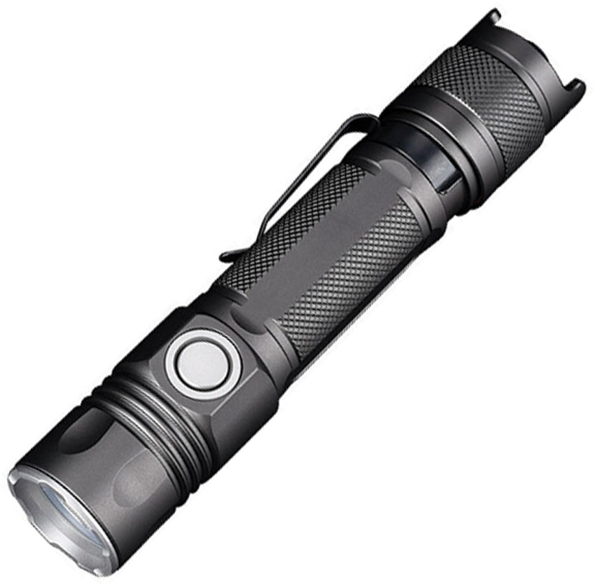 5.75″ overall. Water resistant. Impact resistant. Strobe. Rechargeable. CREE XHP35 LED. Modes: Turbo (2000 lumens, 1.9h runtime); High (1100 lumens, 2h runtime); Middle (380 lumens, 6.5h runtime); Low (85 lumens, 25h runtime); Eco (15 lumens, 140h runtime). USB Type-C charging. 285m beam distance. Requires (1) 21700 battery (included). Aluminum construction. Color: Black. Boxed with hanging tab.