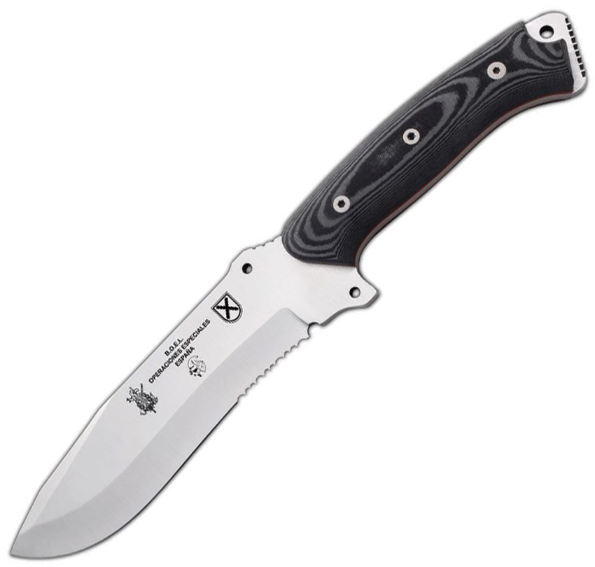 11.25″ (28.58cm) overall. 6.88″ (17.48cm) satin finish partially serrated MV-58 stainless blade. Black micarta handle. Full, extended tang. Lanyard hole. Black leather belt sheath. Boxed.