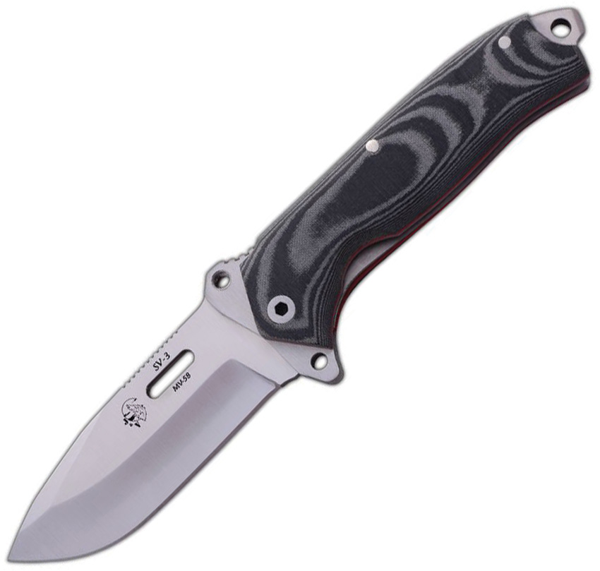 4.5″ (11.43cm) closed. 3.38″ (8.59cm) satin finish MV-58 stainless blade. Black micarta handle. Lanyard hole. Extended tang. Glass breaker. Red liners. Black nylon belt sheath. Boxed.