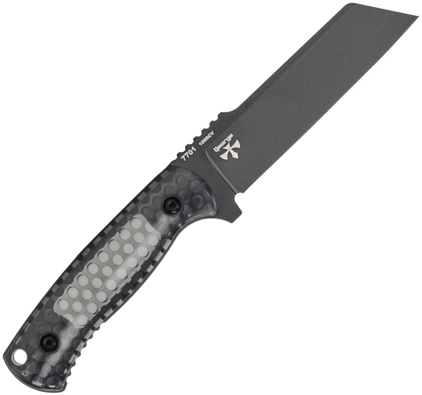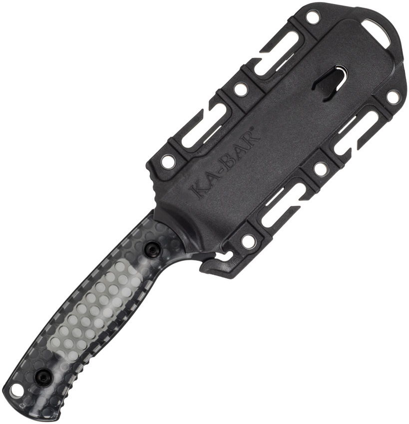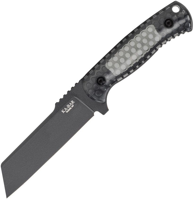9″ (22.86cm) overall. 4.25″ (10.8cm) black finish 1095 Cro-Van carbon steel sheepsfoot blade. Smoked translucent polycarbonate handle. Full tang. Lanyard hole. Black molded plastic belt sheath. Boxed.