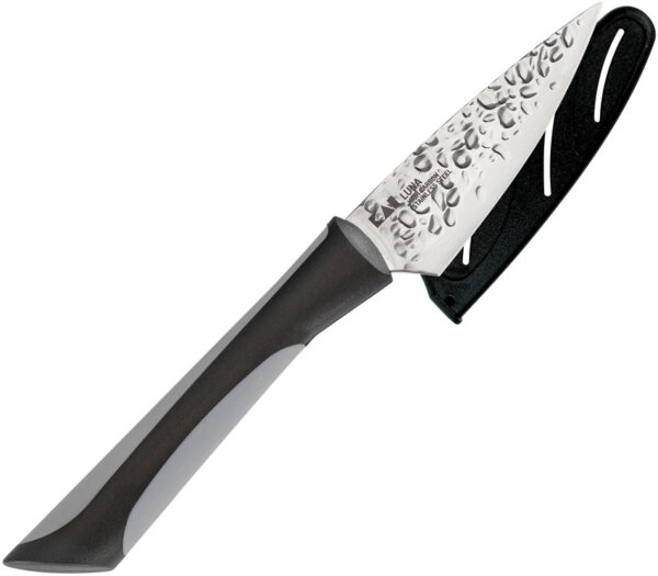 8.75″ (22.23cm) overall. 3.5″ (8.89cm) hammered finish 4116 stainless blade. Synthetic handle. Black and gray soft grip handle. Hand washing and drying recommended. Hang packaged.
